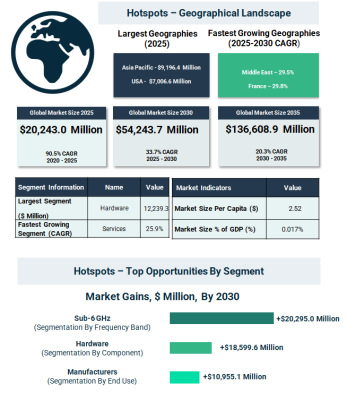 屋内5G市場は急速に拡大しており、2025年には約20,243.0百万ドルに達し、2020年以降年平均成長率90.5%で成長している。2030年には54,243.7百万ドルに達し年平均成長率21.8%で拡大すると見込まれている。この成長は長期的にも継続し、2035年には136,608.9百万ドルに達し、2029年以降年平均成長率20.3%で推移すると予測されている。
