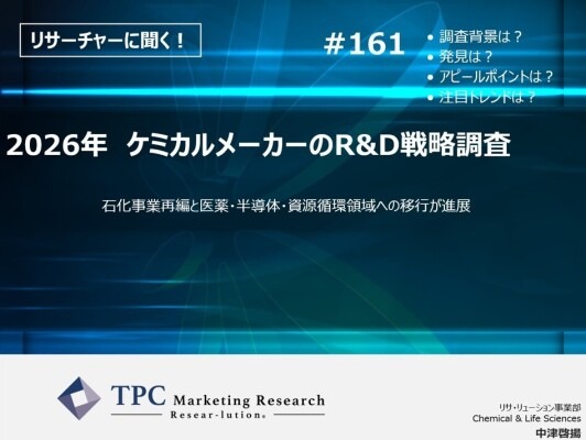 中津:今回の調査は、ご好評をいただいた「2023年 ケミカルメーカーのR&D戦略調査レポート」のリニューアル版として、国内の主要化学メーカー18社を対象に実施しました。前回調査から約3年が経過する中で・・・