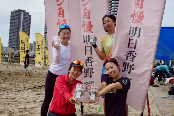 明日香野は「大人の団子(三色・よもぎ使用)」を提供。桜と三色団子という風情ある組み合わせで、試合の合間に多くの方にお楽しみいただけました。自然と見学者がビーチ沿いに集まるなど、にぎわいが会場全体に生まれ、春の競技シーズンの最高のスタートを飾ることができました。