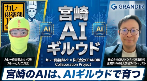 こうした課題に対し、飲食店経営者として現場の苦労を知り、実践目線でAI活用支援を進めてきたカレー倶楽部ルウのルウ王子と人材育成研修やDX・AI推進支援を手がける株式会社GRANDIR代表・長置庄平が協業します。研修と現場、理論と実践、それぞれの強みを掛け合わせることで、宮崎の企業や事業者に寄り添う新たな支援体制をつくってまいります