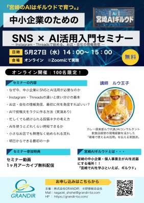 その第1弾として開催するのが、中小企業や個人事業主向けの記念オンラインセミナー「中小企業のためのSNS × AI活用入門セミナー」です。多くの地域事業者が課題を感じやすい情報発信をテーマに、Instagram・Threadsの活用法と、AIを使って無理なく発信を続ける実践的な方法を分かりやすくお伝えします。