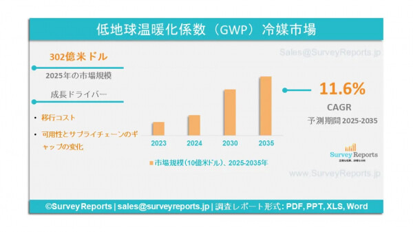 Surveyreportsの専門家による分析によれば、低GWP冷媒市場の規模は2025年に302億米ドルに達した。さらに2035年末には1,024億米ドルに達すると予測されている。低GWP冷媒市場は、2025年から2035年の予測期間においておよそ年平均成長率(CAGR)11.6%で成長すると見込まれている。