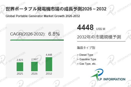 LP Informationの最新「世界ポータブル発電機市場の成長予測2026~2032」(https://www.lpinformation.jp/reports/580364/portable-generator)によると、2026年から2032年のグローバル市場は年平均成長率(CAGR)6.8%で成長し、2032年には約44.48億米ドルに達すると予測されている。この予測は従来型だけでなくインバータ発電機を含むポータブル発電機全体をカバーしており、災害対策、建設、イベントなど幅広い応用分野の拡大が需要を牽引している。この成長率はエネルギー信頼性とユーザーニーズの高まりを反映しており、特に北米やアジア太平洋地域での市場拡大が期待される。同様に他調査機関でも裾野の広い用途とインバータ技術の普及が市場成長の原動力であると示されている。製品別・用途別に見ると、家庭用バックアップ需要と商業・工業用途両方での採用が進んでおり、安定した市場拡大が見込まれている。