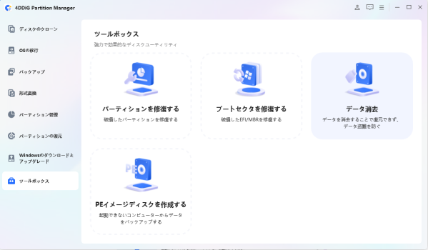 1.4DDiG Partition Managerをインストールして起動します。SDカードを消去する必要がある場合は、コンピュータに接続してください。左のナビゲーションバーから「ツールボックス」を選択し、「データ消去」をクリックして進めてください。