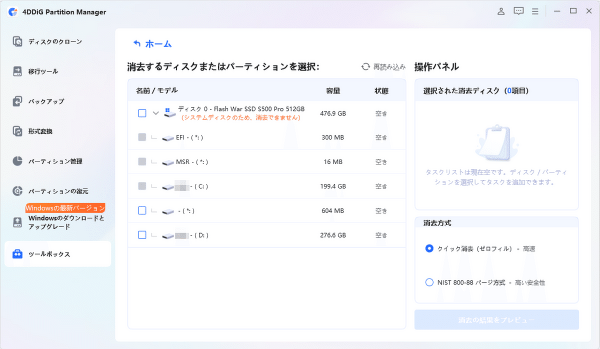 4DDiG Partition Managerを使ってデータを消去する手順は以下の通りです。