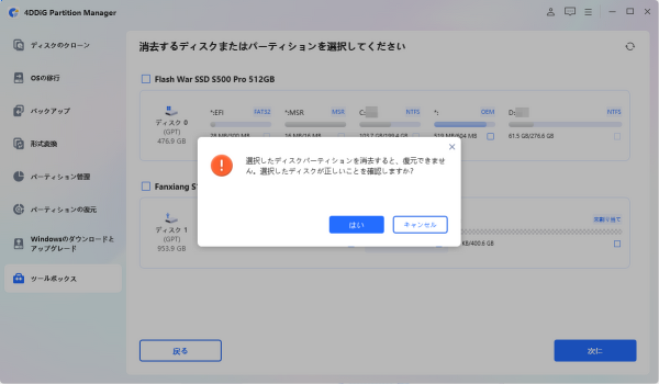 3.ディスクまたはパーティションを正しく選択したことを確認したら、「はい」ボタンをクリックして続行してください。
