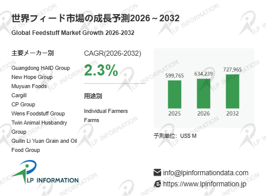 フィード産業のグローバルな発展は、人口増加と食肉・乳製品消費の拡大に支えられ、安定的かつ持続的な成長を示している。LP Information調査チームの最新レポートである「世界フィード市場の成長予測2026~2032」(https://www.lpinformation.jp/reports/602010/feedstuff)によると、2026年から2032年の予測期間中のCAGRが2.3%で、2032年までにグローバルフィード市場規模は7279.65億米ドルに達すると予測されている。この数字はフィード産業が単一の要因に左右されるのではなく、複数の供給要素と需要サイクルが複合的に作用する成熟した産業であることを示している。市場全般では、飼料需要の中心を家禽類が占める一方で、乳用飼料や養殖用飼料にも着実な需要が見られ、地域ごとの畜種構成、消費パターン、政策環境が成長速度の差異を生んでいる。加えて、持続可能性要求の高まりや環境規制の強化が、栄養効率の高い配合飼料や環境負荷低減型原料の投入を促進し、市場競争を新たな次元へと押し上げている。添加物市場でも、高機能性成分の導入により生産性向上と健康維持の両立が進み、新たな付加価値創出が進行中である。これらの傾向は、各国の農業政策、貿易環境、技術的イノベーションとの相互作用の中で、産業の多層的成熟を加速させている。