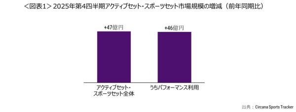 日本の2025年第4四半期のスポーツアパレル市場のうち、上下セットで購入されるアクティブセット・スポーツセット市場規模は253億円で、前年同期比23%増、金額にして47億円増と大きく成長しました。(図表1)。内訳を見ると、ライフスタイル利用・アウトドア利用を除いた、パフォーマンス利用での需要が30%増、金額にして46億円増と、需要増加の大部分を占めていました。