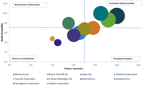 主要企業には、メドトロニック株式会社、ボストン・サイエンティフィック社、バイエル株式会社、テレフレックス株式会社、テルモ株式会社、ビー・ブラウン・メルズンゲン株式会社、バイオトロニック株式会社、ジェネンテック株式会社、セラジェニクス株式会社、グラウコス株式会社が含まれます。これらの企業はイノベーション、提携、事業拡大を通じて市場での地位強化を図っています。