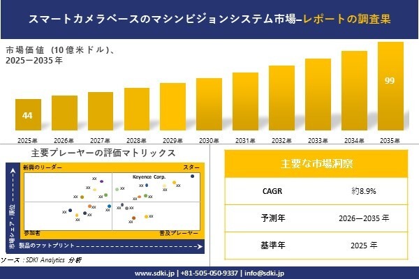 スマートカメラベースのマシンビジョンシステム市場に関する当社の調査レポートによると、スマートカメラベースのマシンビジョンシステム市場規模は 2035 年に約 99 億米ドルに達すると予想されています。さらに、2025 年の スマートカメラベースのマシンビジョンシステム市場規模は約 44 億米ドルとなっています。スマートカメラベースのマシンビジョンシステムに関する市場調査レポートでは、市場は 2026-2035 年の予測期間中に約 8.9% の CAGR で成長するとも述べられています。