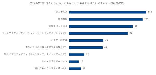 「地元グルメ」110人、「宿泊施設」105人、「絶景スポット巡り」91人、「マリンアクティビティ(シュノーケリング・ダイビングなど)」84人、「お土産・特産品」49人、「島ならではの体験(伝統文化体験など)」48人、「陸上のアクティビティ(サイクリング、ナイトツアーなど)」22人、「スパ・リラクゼーション」14人、「何にでもバランスよく使いたい」17人でした。