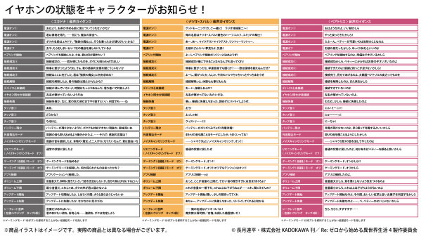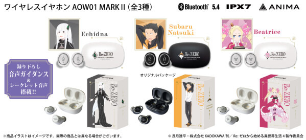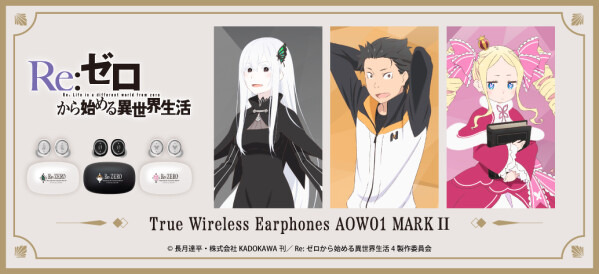 本コラボレーションモデルは「ナツキ・スバル」「ベアトリス」「エキドナ」の3モデル。左右ハウジングに各モチーフをレーザー加工、充電ケース天面に各モチーフと作品ロゴを印刷加工し、作品の世界観を表現したオリジナルデザインとなっております。音声ガイダンスは「ナツキ・スバル」「ベアトリス」「エキドナ」それぞれの新規録り下ろしボイスを搭載。電源オンやオフ、ペアリング時やタップ音、ノイズキャンセリングモード時等、それぞれ計27ワードのボイスを楽しめます。