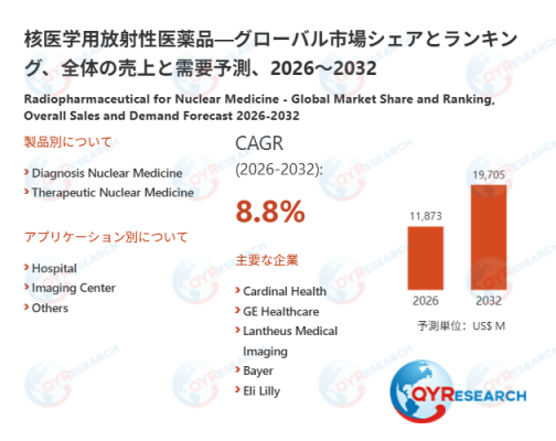 QYResearch調査チームの最新レポート「核医学用放射性医薬品―グローバル市場シェアとランキング、全体の売上と需要予測、2026~2032」によると、核医学用放射性医薬品の世界市場は、2025年に10849百万米ドルと推定され、2026年には11873百万米ドルに達すると予測されています。その後、2026年から2032年にかけて年平均成長率(CAGR)8.8%で推移し、2032年には19705百万米ドルに拡大すると見込まれています。