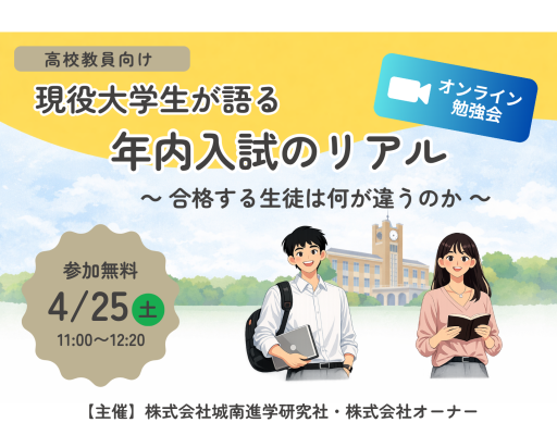 こうした背景を受け、本勉強会では、東北大学および慶應義塾大学SFCに年内入試で合格した現役大学生2名が登壇。受験当時の具体的な取り組みをもとに、「合格する生徒に共通する思考・行動」を解き明かします。合格者自身の視点から語られる「具体的なプロセス」を通じて、現場ですぐに活用できる指導のヒントを提供します。