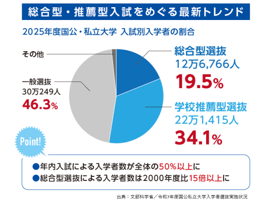 近年、総合型選抜・学校推薦型選抜といった「年内入試」は拡大を続けており、私立大学では入学者の半数以上を占めるケースも見られます。これに伴い、高校現場では、探究学習の指導や志望理由書の添削、面接対策など、従来の一般選抜とは異なる対応が求められています。