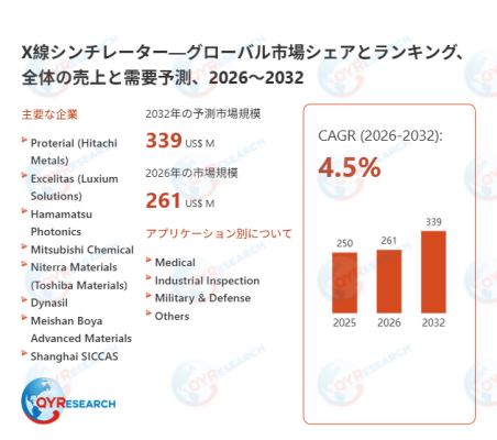 QYResearch調査チームの最新レポート「X線シンチレーター―グローバル市場シェアとランキング、全体の売上と需要予測、2026~2032」によると、X線シンチレーターの世界市場は、2025年に250百万米ドルと推定され、2026年には261百万米ドルに達すると予測されています。その後、2026年から2032年にかけて年平均成長率(CAGR)4.5%で推移し、2032年には339百万米ドルに拡大すると見込まれています。