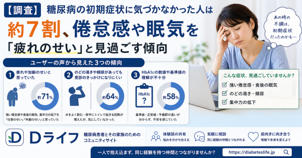 糖尿病患者とその家族のためのコミュニティサイト『Dライフ( https://diabeteslife.jp )』を運営する合同会社MYASIA Entertainmentは、このたび糖尿病の初期症状に関する相談傾向と検索動向をもとに、ユーザーの声を整理した調査結果をまとめました。健康診断でHbA1cの数値を指摘されて初めて糖尿病の可能性に気づく方が増えている一方で、振り返ると「あの時の不調が初期症状だった」と感じている方が多いことがわかってきました。
