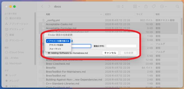 「会議資料に日付を追加したい」「"_copy"を全部消したい」程度であれば十分です。ただし、ファイルの内容を読んで名前をつけることや、拡張子の一括変更には対応していません。