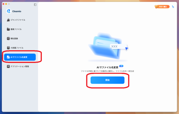 1. Cleamioを起動し、左サイドバーから「AIでファイル名変更」>「開始」をクリック。