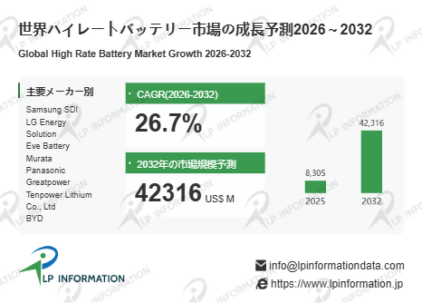 LP Information調査チームの最新レポートである「世界ハイレートバッテリー市場の成長予測2026~2032」(https://www.lpinformation.jp/reports/589745/high-rate-battery) によると、グローバルハイレートバッテリー市場は2026年から2032年の予測期間においてCAGR26.7%という急速な成長を見込まれており、2032年には423.16億米ドル規模に達するとされる。この数字は単に数量的な成長を示すだけではなく、出力性能をキーとする用途が世界的に拡大する構造を反映している。特に、エネルギー密度と出力密度の両立が設計課題となる電動モビリティや産業機器分野では、ハイレート特性が競争軸になりやすい。その結果、ユーザーは単なる“エネルギー保持量”ではなく“瞬時性能”に基づく選択を行う局面が増えている。市場規模予測の成長パスは、機能要件の高度化と用途拡大が並行し、従来のバッテリー用途から新規需要層を取り込むフェーズに移行していることを示す。安定的な成長シナリオにおいては、市場は数量ベースのボリュームドライバーだけではなく、高付加価値製品の拡張が進む性質を持つ。