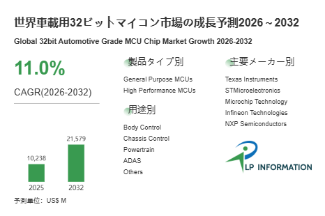 LP Information調査チームの最新レポートである「世界車載用32ビットマイコン市場の成長予測2026~2032 」(https://www.lpinformation.jp/reports/683429/32bit-automotive-grade-mcu-chip)によると、2026年から2032年の予測期間中のCAGRが11.0%で、2032年までにグローバル車載用32ビットマイコン市場規模は215.79億米ドルに達すると予測されている。成長の骨格は三つある。第一に電動化とADASの普及により、制御点数と演算量が増大し、より高性能で統合度の高いマイコンへの置換が進む点である。第二にゾーン型やドメイン集約など車両E/Eアーキテクチャの再設計が加速し、I/O集約やゲートウェイ機能を担う汎用車載MCUの採用が拡大する点である。第三に安全とセキュリティの要求水準が上がり、開発プロセスそのものが高度化する点である。結果として、ハードウェア性能だけでなく、MCALやドライバ、セーフティライブラリ、仮想環境、ツールチェーンを含むソフトウェア資産の厚みが、量産立上げスピードと継続採用を左右する構図が鮮明になっている。
