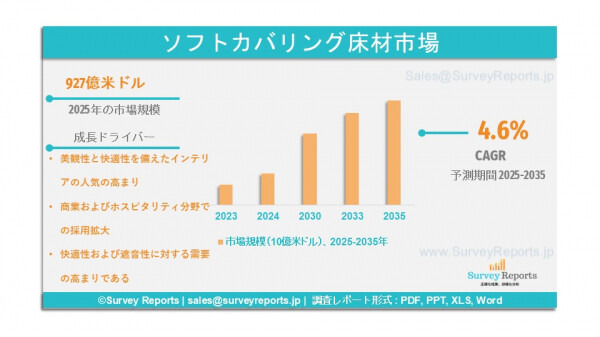 Surveyreportsの専門家によるソフトカバリング床材市場調査の分析によれば、同市場の規模は2025年に927億米ドルを創出したことが確認されている。さらに、ソフトカバリング床材市場は2035年末までに1,236億米ドルに達する収益を見込まれている。同市場は、2025年から2035年の予測期間において、約4.6%の年平均成長率(CAGR)で成長すると提案されているのである。