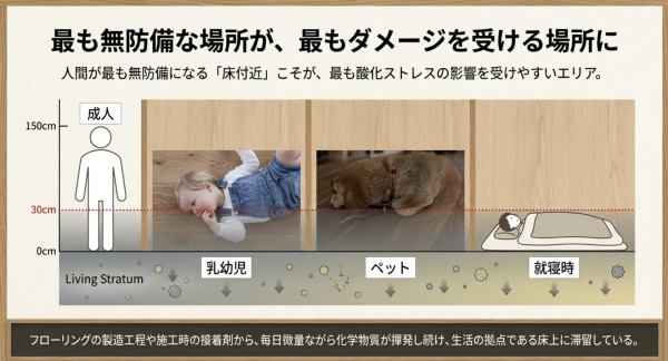 【専門家・行政も鳴らす警鐘:見過ごされてきた「床上30cm」の危機】 特に「床上30cm」の空間で生活する犬や猫などのペットは、化学物質の恒常的な曝露による深刻な影響を受けやすく、各分野から以下の通り警鐘が鳴らされています。この事実からも、床面における化学物質への配慮は「必須」と言えます。