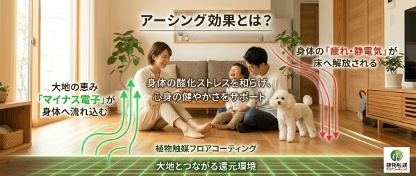 『植物触媒フロアコーティング』は、植物の力が持つ「マイナス電子の生成」と「静電気の抑制」機能により、室内にいながらにして大地と繋がるような還元環境を創出。身体の酸化ストレスを和らげ、人間やペットが本来持つ健やかな状態をサポートします。