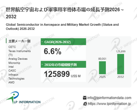 LP Informationの「世界航空宇宙および軍事用半導体市場の成長予測2026~2032 」(https://www.lpinformation.jp/reports/586252/semiconductor-in-aerospace-and-military)によれば、当該市場は2026~2032年の予測期間中にCAGR6.6%で成長し、2032年には市場規模が1258.99億米ドルに達すると予測されている。これは、商用半導体市場の波動とは独立して、航空宇宙・軍事分野固有の投資や装備近代化計画が底堅く推移する市場構造を反映している。成長率が示すように、単年度の急騰ではなく安定的な拡大トレンドにあることが読み取れる。特に、宇宙探査プロジェクト、防衛装備更新、軍事用電子機器の性能強化など長期プロジェクトが支える市場であるため、短期のマクロ経済変動よりも中長期の戦略投資・政策計画の影響を受けやすい。また、航空宇宙・軍事用プロジェクトは一般に長い開発・認証期間を要するため、市場全体の成長カーブは緩やかで持続的な特性を有する。これは、同市場が成熟したボリューム市場ではなく、高付加価値ニッチ市場としての性格が強いことを意味する。