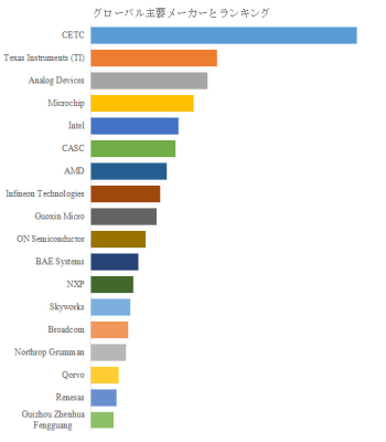 LP Informationのトップ企業研究センターによると、航空宇宙および軍事用半導体の主要製造業者にはCETC、Texas Instruments (TI)、Analog Devices、Microchip、Intel、CASC、Infineon Technologies、AMD、Guoxin Micro、ON Semiconductorなどが含まれる。2025年のデータでは、世界のトップ5企業の市場シェアは売上ベースで約5.0%にとどまり、トップ10企業でも約7.0%に留まる分散型の構造である。これは、用途・仕様ごとに求められる技術要件が大きく異なること、ならびに各国・各用途ごとに独自の認証要件や供給体制が存在することを反映している。航空宇宙・軍事用途では、同一製品であっても航空機搭載用、衛星搭載用、防衛システム用など、信頼性基準や認証プロセスが用途別に細分化される傾向があり、特定企業の一極集中が起こりにくい市場構造を形成している。また、政府調達や安全保障関連のポリシーが企業選定に影響するため、地域ごとの強みや戦略的パートナーシップがシェア形成の背景要因となる。結果として、競争は単一の規模勝負ではなく、用途別技術適合性・供給信頼性・認証対応力といった総合的な力で評価される傾向が鮮明である。