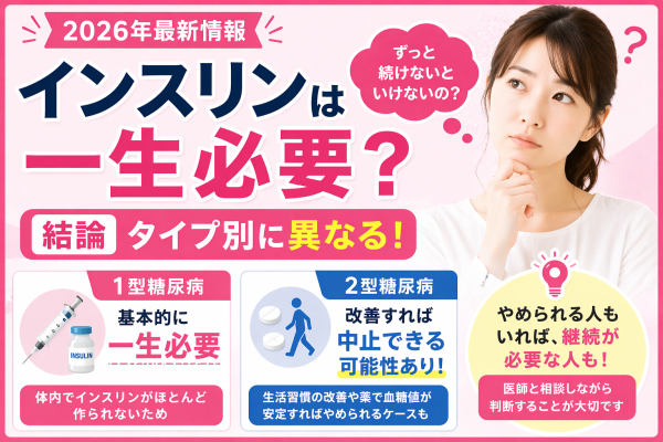 インスリン治療を始めたとき、「これから一生続けなければいけないのか」と不安に感じる方は非常に多く見られます。結論から言うと、インスリンが一生必要かどうかは糖尿病のタイプや状態によって異なります。2型糖尿病では一時的に使用して中止できるケースもありますが、1型糖尿病では基本的に継続が必要です。