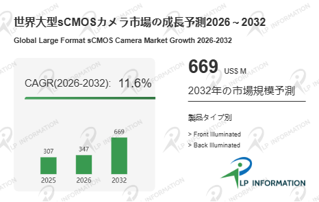 LP Information調査チームの最新レポートである「世界大型sCMOSカメラ市場の成長予測2026~2032」(https://www.lpinformation.jp/reports/599453/large-format-scmos-camera)によると、2026年から2032年の予測期間中のCAGRが11.6%で、2032年までにグローバル大型sCMOSカメラ市場規模は6.69億米ドルに達すると予測されている。本市場は、研究用計測と産業用検査の双方で広視野化と高速化が同時進行し、撮像データの価値が装置性能そのものを規定する局面に入ったことを背景に、堅調な拡大局面にある。特徴は、用途側が求める要件が単一ではなく、低照度、広視野、高フレームレート、定量性、装置統合性が同時に要求される点にある。結果として、センサー世代更新、冷却や光学系との整合、ソフトウェア連携を含む総合性能が購買判断を左右し、研究向けとOEM/産業向けが同じ技術潮流の上で並走する市場構造が形成される。