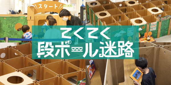 巨大段ボール迷路×デジタルスタンプラリー。迷路の中に隠れた昆虫や恐竜のたまごを見つけてタブレットで撮影。全部見つけてゴールをめざします。