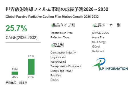 LP Information調査チームの「世界放射冷却フィルム市場の成長予測2026~2032 」(https://www.lpinformation.jp/reports/593871/passive-radiative-cooling-film)によれば、放射冷却フィルム市場は2026~2032年にCAGR25.7%で拡大し、2032年には市場規模0.72億米ドルに達する見通しである。成長率の水準は、材料が研究テーマから実装・採用フェーズへ移行しつつある段階を示唆する一方、絶対規模はまだ小さく、用途別・地域別の立ち上がりが市場全体の数字に反映されやすい構造である。すなわち、導入プロジェクトの採否、仕様認定の進捗、量産立上げのタイミングが、短期の需給と価格形成に与える影響が相対的に大きい市場である。したがって、成長トレンドは上向きである一方、局所的な需要の波が見えやすい点が特徴である。