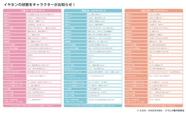 本コラボレーションモデルは「朝凪海」「天海夕」「新田新奈」3モード搭載の1モデル。作品タイトルとモチーフを充電ケースと左右ハウジングプレートに配置。音声ガイダンスは「朝凪海」「天海夕」「新田新奈」の新規録り下ろしボイスを搭載し、タップにてキャラクターの切り替えが可能なモードチェンジ仕様となっております。電源オンやオフ、ペアリング時やタップ音、ノイズキャンセリングモード時等、それぞれ計25ワードのボイスを楽しめます。パッケージは描き下ろしイラストデザインとなっております。