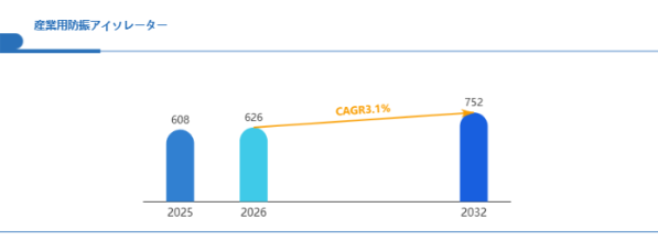 Global Reports調査チームの最新レポート「グローバル産業用防振アイソレーター市場規模、主要企業シェア、ランキング分析レポート【2026年版】」によると、2026年の626百万米ドルから2032年には752百万米ドルに成長し、2026年から2032年の間にCAGRは3.1%になると予測されています。