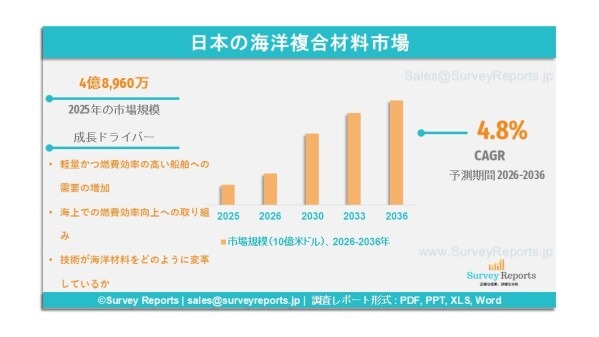 Surveyreportsの専門家による分析によれば、日本の海洋複合材料市場規模は2025年に4億8960万米ドルであったとされる。さらに、2036年末までに市場収益は7億8570万米ドルに達すると予測される。日本の海洋複合材料市場は、2026年から2036年の予測期間において約4.8%の年平均成長率(CAGR)で成長すると見込まれる。