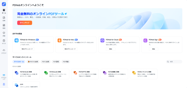 たまにPDFを扱うライトユーザーや、ソフトをインストールしたくない人、外出先や別端末から手軽に作業したい人に最適です。6. PDNob Online:完全無料で使えるオールインワンのオンラインPDFツール