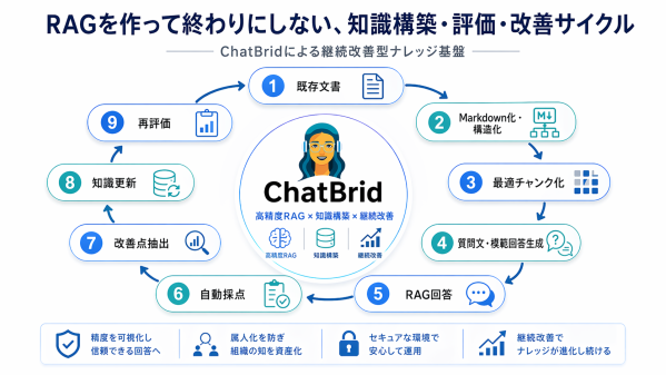 「知識構築サービス」と組み合わせることで、ChatBridは単なる検索・回答システムではなく、知識の作成、評価、改善、再利用を一体化した企業ナレッジ基盤として機能します。
