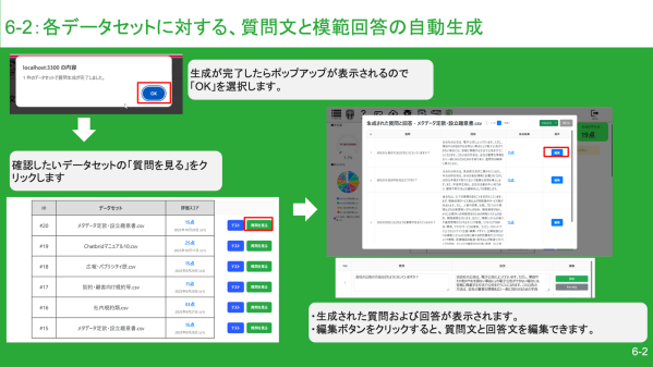 取り込んだ知識をもとに、実際の利用者が尋ねそうな質問文と、それに対する理想的な模範回答を自動生成します。