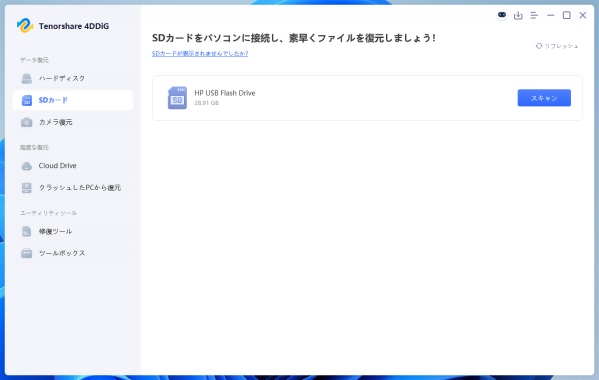 ホーム画面の「ハードドライブ」一覧にある「外付けデバイス」セクションから、接続したSDカードを選択します。右下の「スキャン」をクリックします。