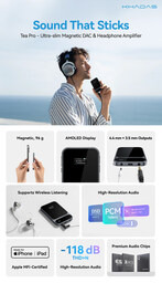 Tea Proは、Teaシリーズの特徴である磁気カード・スタイルのデザインを継承し、iPhoneにしっかりと固定する19個の磁石が内蔵されています。Androidまたは12より前のiPhoneでも、同じ磁気アタッチメント用の磁気リングを使用できます。アップグレードされたレザー・バックにより、より優しくノイズのないスナップ感が得られます。わずか8mmの薄さ、96gの重さなので、どこにでも簡単に持ち運べます。内部には、PCM 768kHz / DSD512をサポートするフラッグシップUSB DAC XMOS XU316-1024が搭載されており、ESS ES9039Q2M DAC、Qualcomm QCC5181 Bluetooth、aptX、aptX HD、aptX Adaptive、LDACコーデックのサポート、100fsフェムト秒クロックと組み合わされ、クリーンで詳細なスタジオ・グレードのサウンドを保証します。