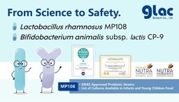 Glac Biotechの最初のGRAS通知株であるMP108は、2021年にニュートライングリディエンツ・アワードの最終候補に選出され、2023年にFDAの認証を取得しました。同株は、アジアで初めて乳児向け用途として認証されたプロバイオティクス株となります。臨床データおよび安全性データに基づき、MP108は1食当たり最大10⁹ CFUの使用が認められており、以下の製品に利用可能です。