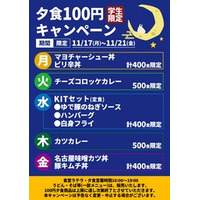 【仲間との課外活動の充実目指して】金沢工業大学が11月17日(月)から「100円夕食」(期間限定)。