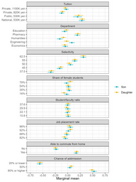 図1は、親が子どもの受験先をどう評価するかについて、さまざまな要素(大学の種類、学部、通学方法など)がどのように影響しているかを示したものです。女子割合が高い大学や文学部(=Humanities)への受験を予定している場合に、親の評価は高くなります。ここからは、進学に対する親の意識にはジェンダーによる違いがあることが示唆されます。