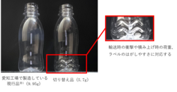 今回の軽量化では、ペットボトル本体を、愛知工場で製造している現行品※1の9.95gから5.7gへと減量します。輸送時の衝撃や積み上げ時の荷重などにも対応できるよう、発売以来初めてボトル下部に波線を加えました。波線を追加することでラベルのはがしやすさも向上しています。また、今回はキャップ部分の軽量化にも取り組み、キャップの高さを1.5㎜低くするなどし、約13%プラスチック使用量を削減しています。キャップを低くすることによるつかみにくさを軽減するため、開栓時に滑り止めとなるギザギザ部分(ナール)を工夫することで、プラスチック使用量の削減と開けやすさの両立を実現しました。
