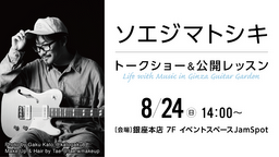 株式会社山野楽器(本社:東京都中央区銀座、代表取締役社長 山野政彦)は、2025年10月にオープン1周年を迎える銀座本店 4F Ginza Guitar Gardenの記念企画として、8月24日(日)に銀座本店 7F イベントスペースJamSpotにて、ソエジマトシキ氏によるトークショー&公開レッスンを開催いたします。応募抽選で80名さまをご招待。