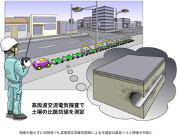 産総研は、周波数が20 kHz程度の高周波の交流電流を使って、アスファルトやコンクリートの路面を傷つけることなく、土壌の比抵抗を測定できる技術を開発しています。この技術では、水道管が埋まっている深さの土壌の比抵抗を測定することで、その場所に腐食性の土壌があるかどうかを判断できます。この高周波交流電気探査技術は、高周波交流電流によるキャパシタンス効果を利用することで、舗装を壊すことなく地下の比抵抗を測定できるのが特徴です(2017年7月11日 産総研プレス発表)。