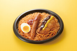 ケチャップととんかつソースをかけたチキンカツとウインナーをトッピングした、総重量約500gのボリューム感のあるプレートです。