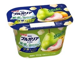 左から「明治ブルガリアヨーグルト 果実Special 洋梨ミックス」「同 フルーツバリエ」(各180g)